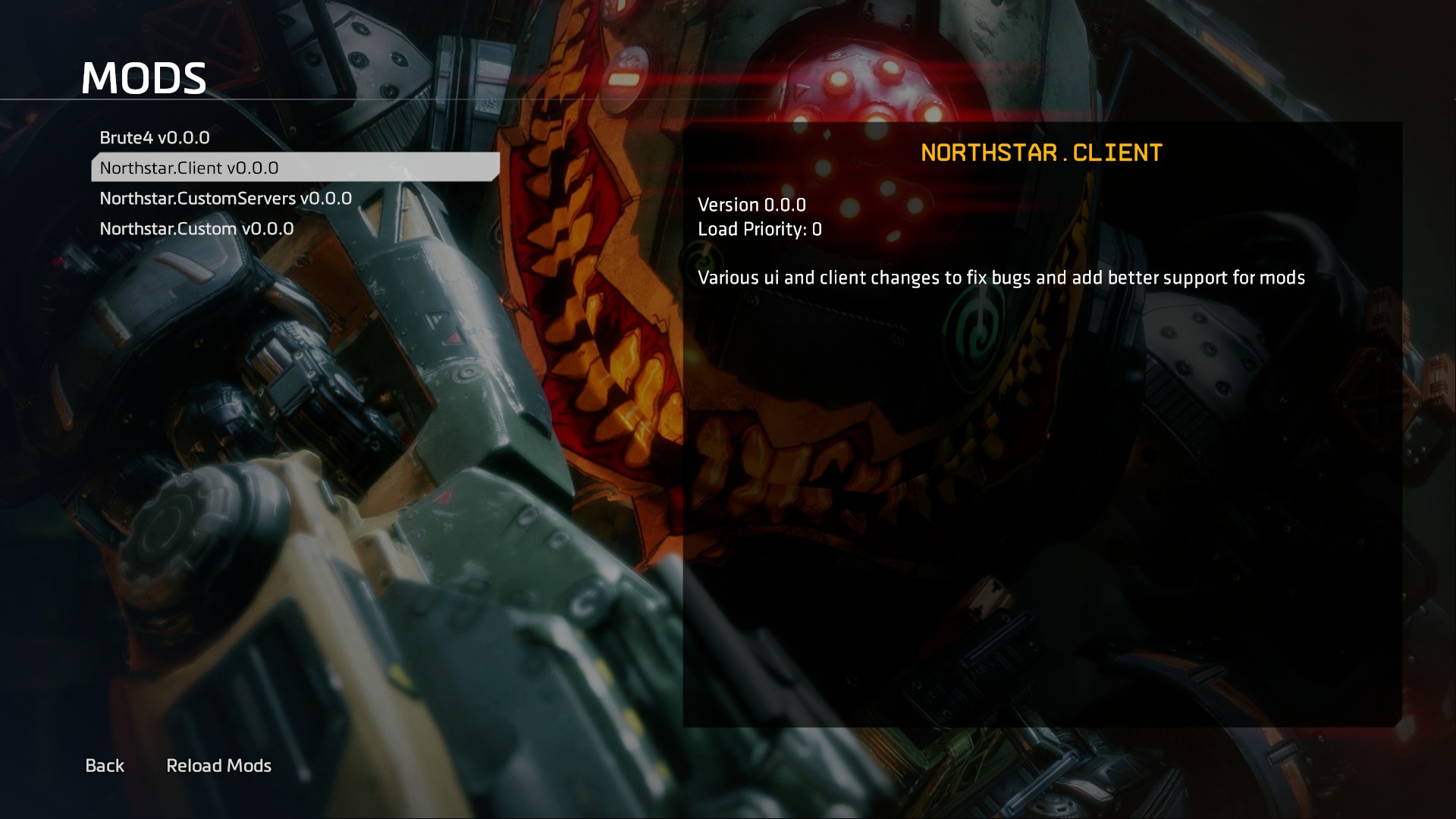 Northstar by default comes with 3 mods installed. They are located in the Titanfall2\R2Northstar\mods folder. You can access these from the Mods menu at the bottom of the main menu.